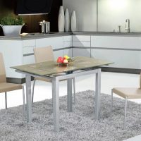 L'option la plus chère. Il est très difficile de trouver des modèles de tables coulissantes en un tel matériau, mais l’apparence exceptionnelle de tels produits pousse les gens à rechercher des tables en pierre.