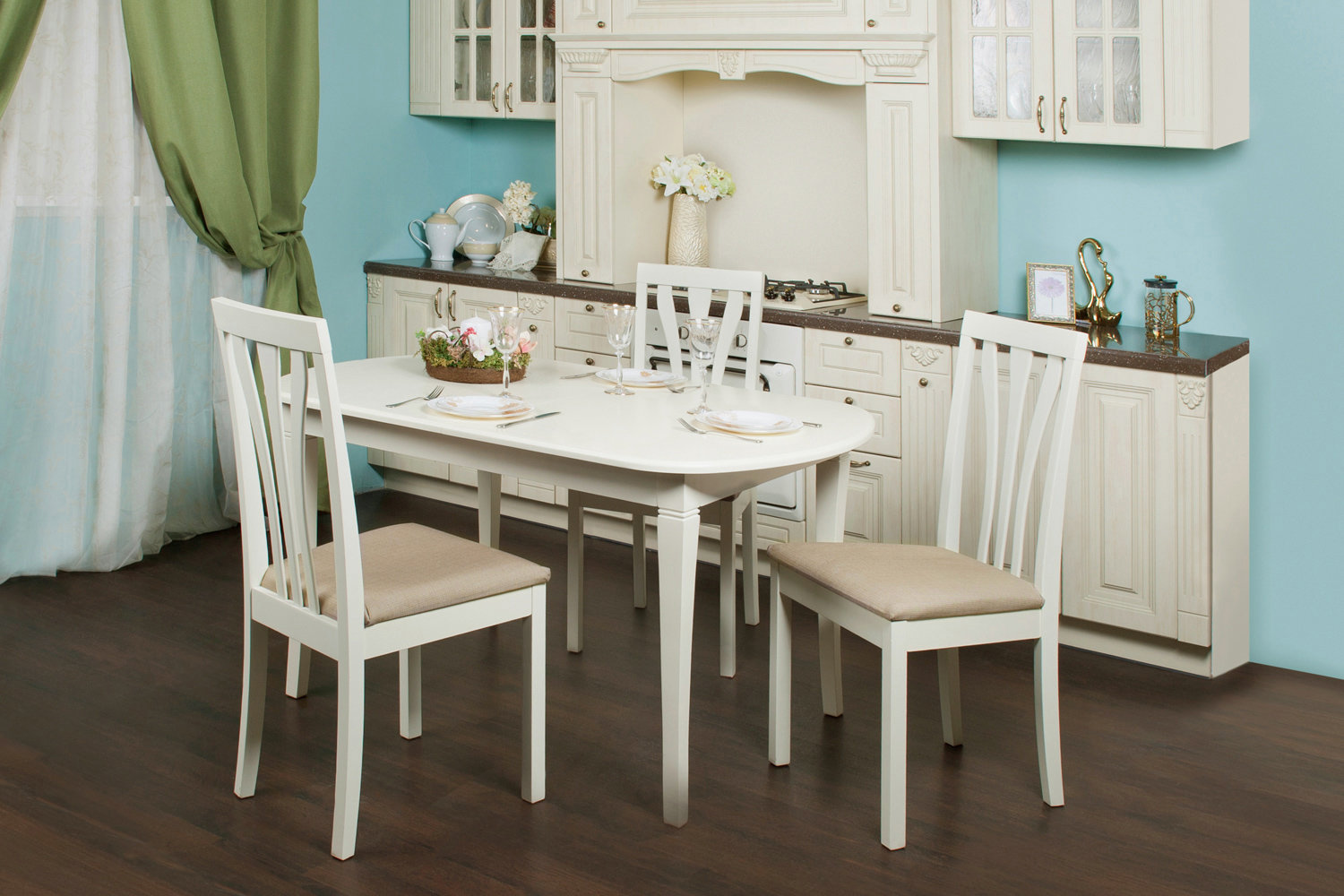 ● le long du mur. Cette disposition de la salle à manger se retrouve souvent dans les réalités urbaines russes. Mettre un groupe sur le mur des propriétaires de la maison peut avoir plusieurs raisons à la fois. Par exemple, une petite surface de la cuisine ou un petit nombre de personnes dans la famille. Après tout, si vous êtes deux, trois ou même quatre, vous n’avez peut-être besoin que de trois côtés de la table.