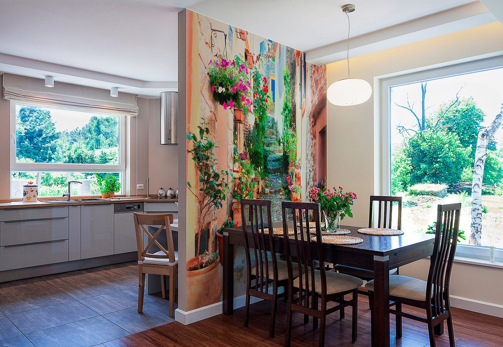 Si vous avez un nouveau studio-cuisine, vous n'avez simplement aucune autre option pour placer la salle à manger. Sinon, vous aurez trop d'espace vide au centre et vous aurez l'air moche et inconfortable. Ne négligez pas non plus l’utilisation d’une table pliante à l’intérieur de la pièce.