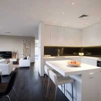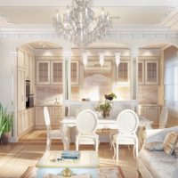 - l'éclairage. Sur la surface de travail de la cuisine, de nombreuses petites lampes à LED sont utilisées, un beau lustre est suspendu au-dessus de la table à manger et une lampe de sol est placée dans la zone de loisirs.