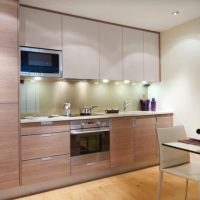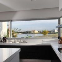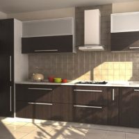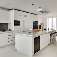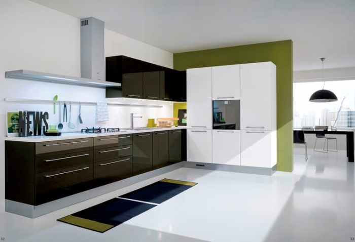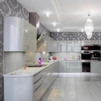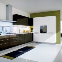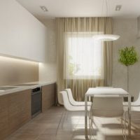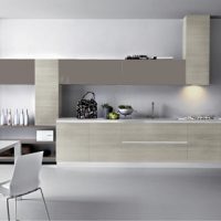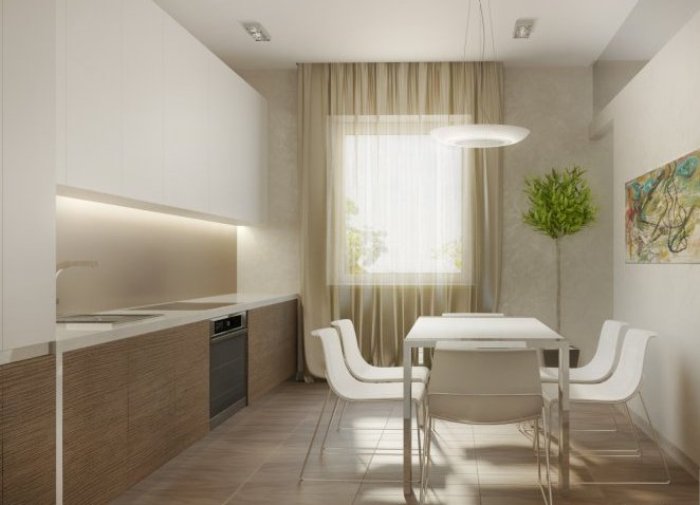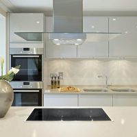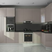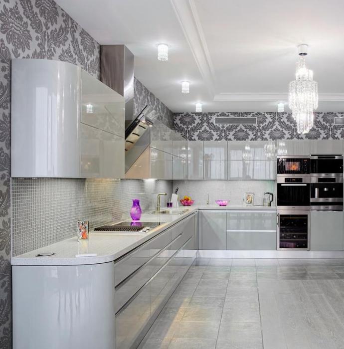 La conception est réalisée dans un ou au maximum de deux couleurs du set de cuisine avec appareils intégrés au ton du meuble. Pour créer ce style, choisissez des combinaisons de couleurs blanche, noire, grise et beige avec une texture brillante. Finition des sols et des murs pour correspondre au mobilier. Éclairage maximal d'un espace avec des fenêtres ouvertes sur lesquelles des stores sont souvent suspendus au lieu de rideaux.