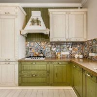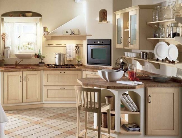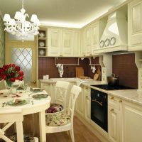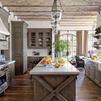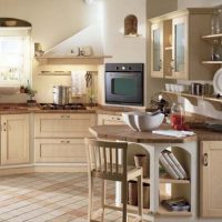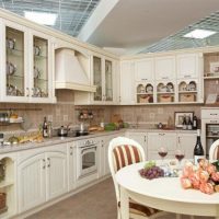 Dans ce style, les meubles de couleur claire sont installés à l'aide du décor de plans de travail plus sombres en matériaux naturels: le bois et la pierre seront toujours à la mode. La conception générale de la pièce implique une grande pièce lumineuse avec de petites touches de couleur sous la forme d’un tablier sur la surface de travail, combiné dans le même style avec une table dans la salle à manger. Le linoléum sur le sol, stylisé en arbre, aura fière allure - tous les matériaux de décoration doivent être naturels.