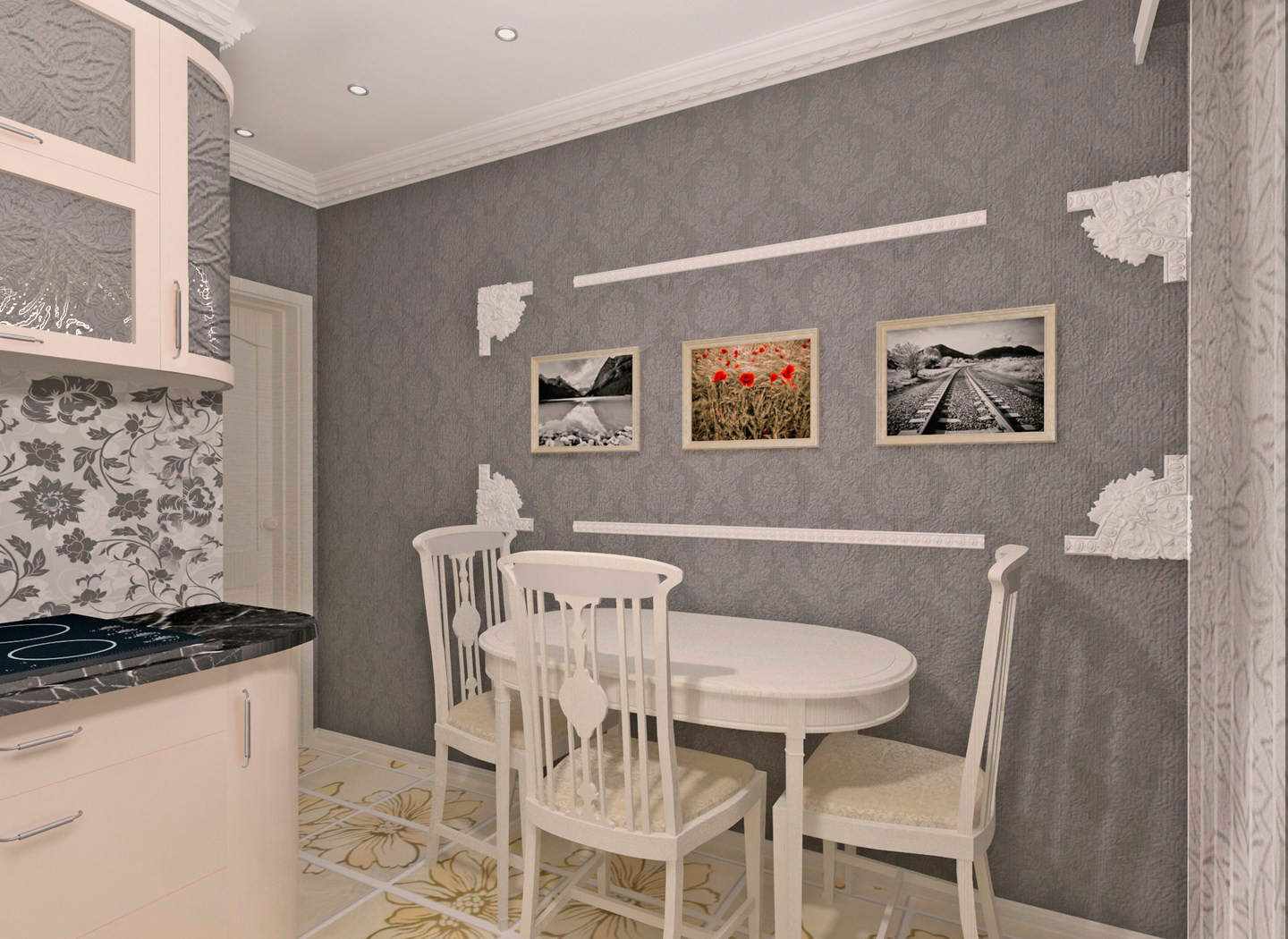 Pour la restauration d'un ensemble de cuisine de vos propres mains, vous pouvez appliquer une peinture avec collage supplémentaire d'éléments bouclés en plâtre.