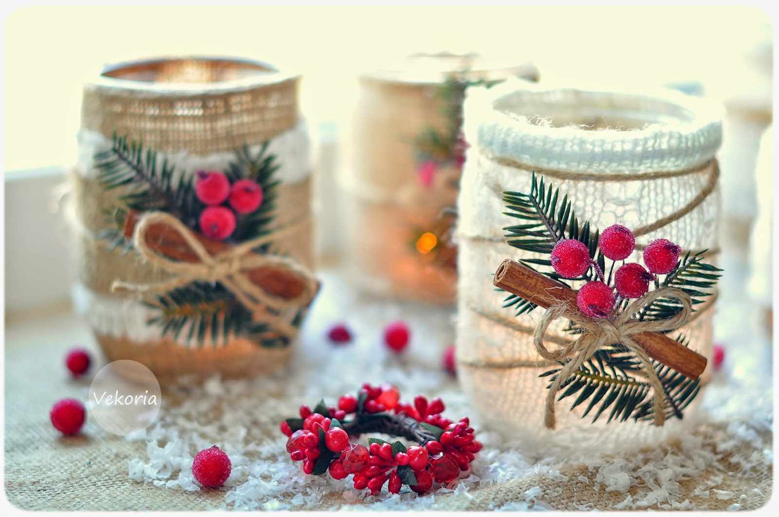 Les lunettes avec des banques peuvent également apparaître comme un chandelier. Ils sont décorés avec des peintures, découpage ou enveloppés avec de la ficelle. Après le décor, ils sont prêts à être utilisés, il reste à mettre à l'intérieur de la bougie-pilule.