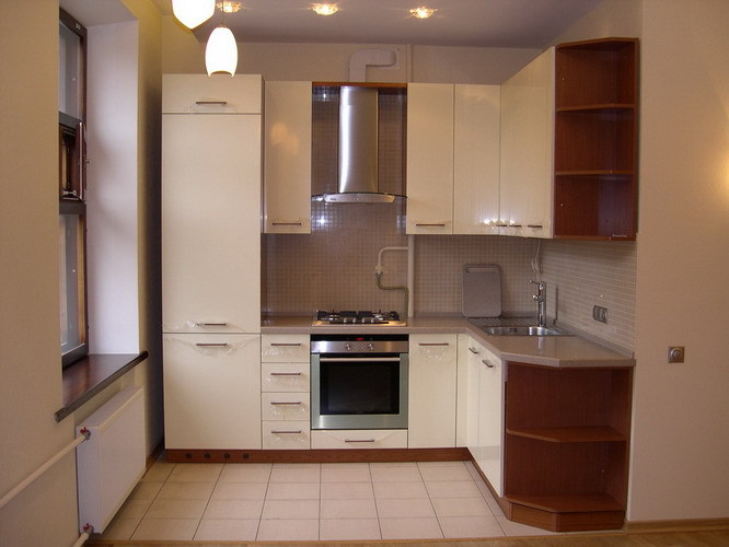 Le conseil qu’avant d’acquérir quelque chose de nouveau, c’est de se débarrasser de l’ancien, la cuisine de la petite Khrouchtchev reste le plus pertinent. Ici, non seulement il n’ya pas d’espace supplémentaire, même quelques centimètres de large ne sont pas suffisants pour un accès facile, s’il ya des meubles de rangement. Bien que les meubles intégrés coûtent un peu plus cher lorsque vous appelez le maître qu'une cuisine finie, il s'agit de la solution la plus rationnelle pour fixer tous vos ustensiles de cuisine.