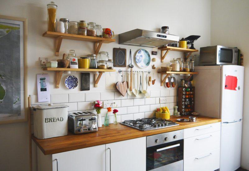 - Armoires et étagères (pour ranger la nourriture, les ustensiles et autres ustensiles de cuisine);