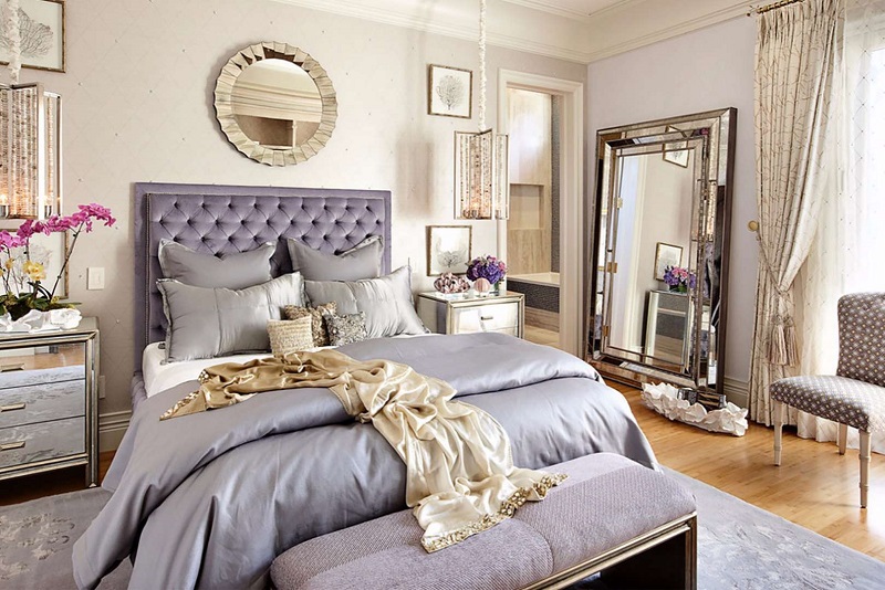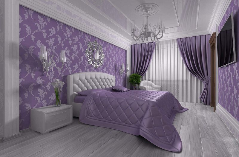 Dans le cas où la chambre est conçue pour les conjoints, alors un compagnon à la base lilas parfait gris, blanc ou ivoire. L'espace de la pièce sera doux et magique, et si vous ajoutez des nuances dorées, la chambre deviendra plus solennelle.