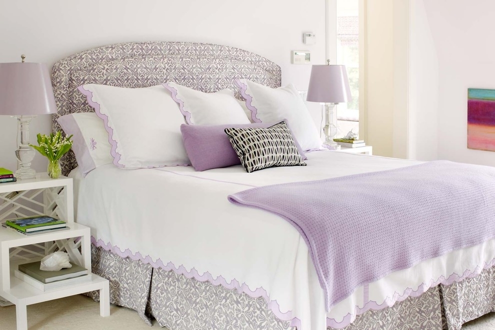 Au cas où vous n'oseriez pas ou ne voudriez pas faire des murs de lavande, «habillez-les» dans des tons neutres clairs et ajoutez une nuance de lilas ou de lavande aux façades et au capitonnage, à la tête de lit, aux oreillers et aux rideaux de lavande.