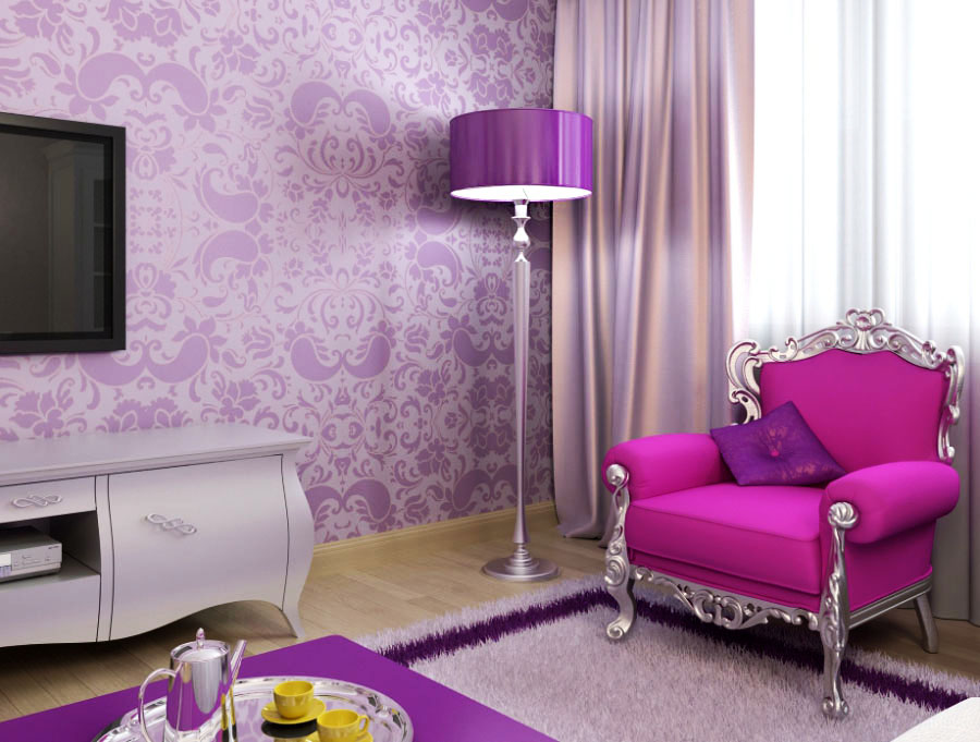 En raison de cette caractéristique, non seulement les femmes veulent voir la couleur de la lavande dans les intérieurs de leur salon et de leur chambre, mais les hommes ne sont pas pressés de l'abandonner car cette nuance est universelle.