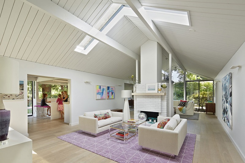 Dans une grande pièce lumineuse, la couleur lavande convient aux ouvertures de fenêtres.