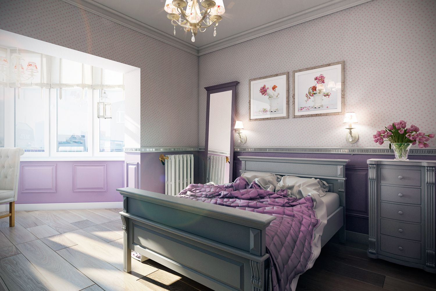 Les teintes lilas et lavande claires rappellent les fleurs du printemps et rendent la pièce plus propre et plus claire.
