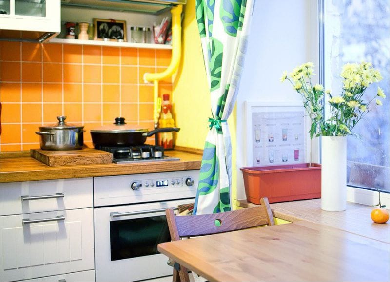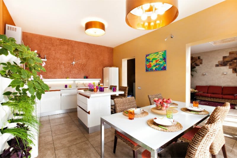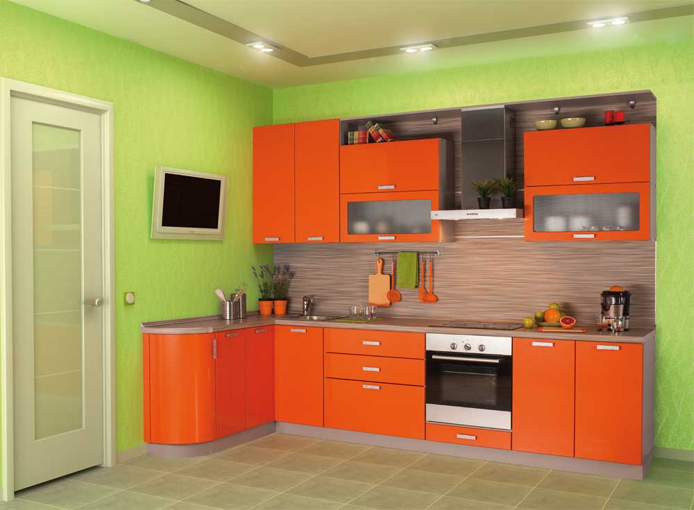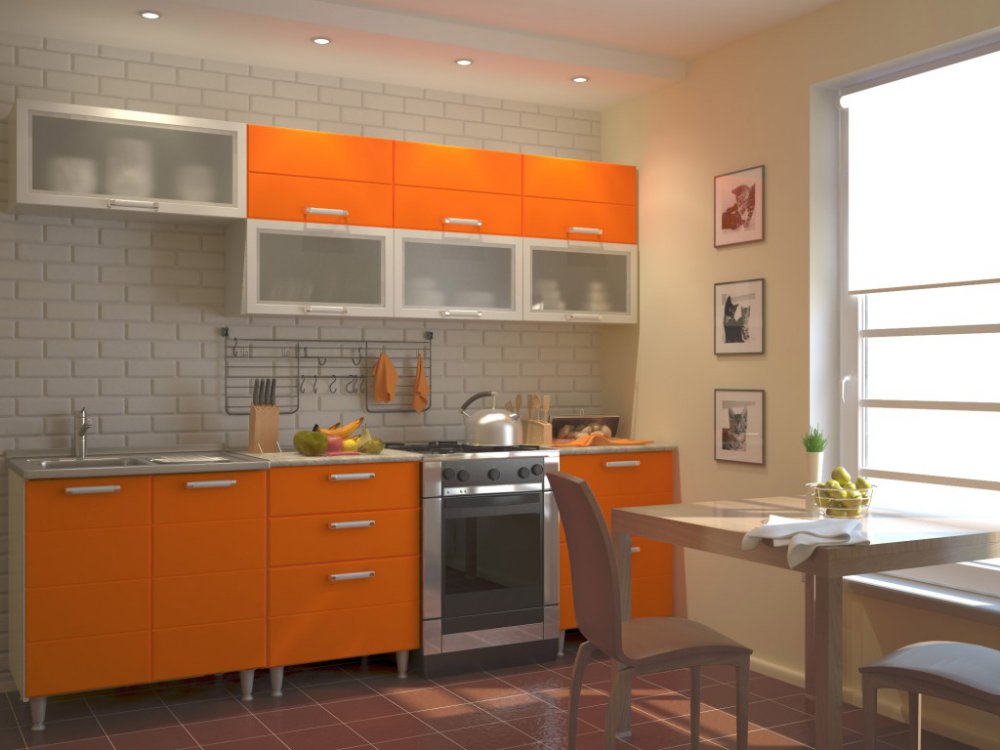Dans les meubles de cuisine, cette couleur reste tout à fait acceptable dans la plupart des décisions stylistiques. Il s’agit tout d’abord de motifs de fruits et d’agrumes pouvant décorer un intérieur de cuisine urbaine accentué dans un style hi-tech ou loft, avec sa maçonnerie en brique.