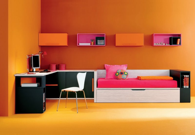 Les fans d’avant-garde, de futurisme ou d’expressionnisme sont acceptables, même les teintes acides. Mais il est préférable d’équiper un rétro-éclairage orange vif ou d’arranger un objet intéressant, par exemple une housse de chaise bien dissimulée dans un coin de la pièce. Cela ne fatiguera pas le nerf optique si vous travaillez dos à l’objet de la nuance spécifiée.
