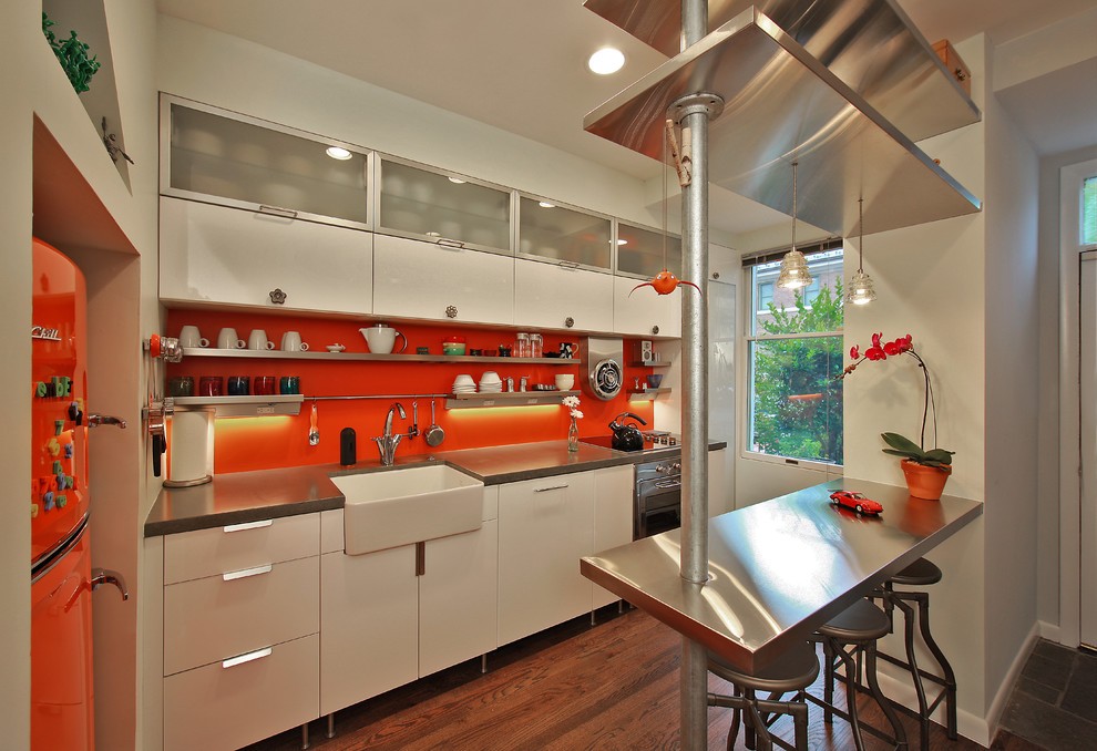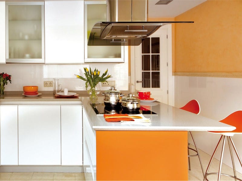 En peignant le mur en orange, la cuisine sera plus large et plus spacieuse