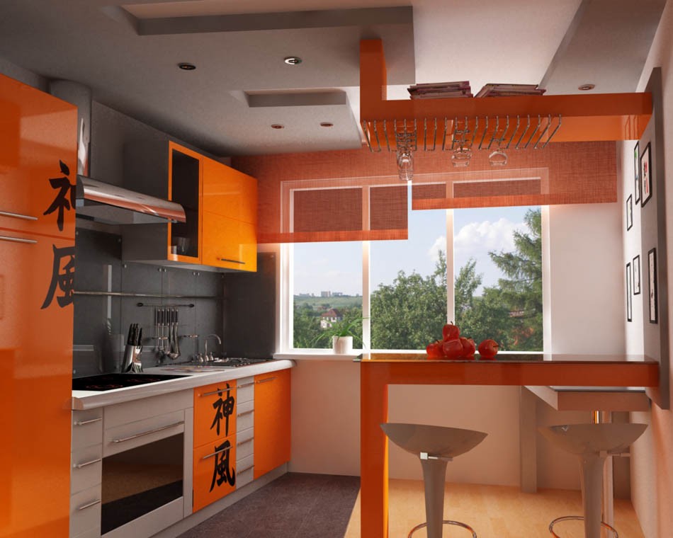 L’excès d’orange à l’intérieur de la gamme principale s’active, puis se fatigue et s’épuise. De plus, sur le fond des meubles orange de la cuisine, les objets les plus pâles vont «se perdre». Mais dans un design moderne, avec une utilisation raisonnable de ses nuances, les meubles en plastique et les étagères en verre ont fière allure. Même une petite cuisine avec une fenêtre nord aura l'air plus spacieuse, saturée de lumière et d'air, comme dans l'exemple de la photo.