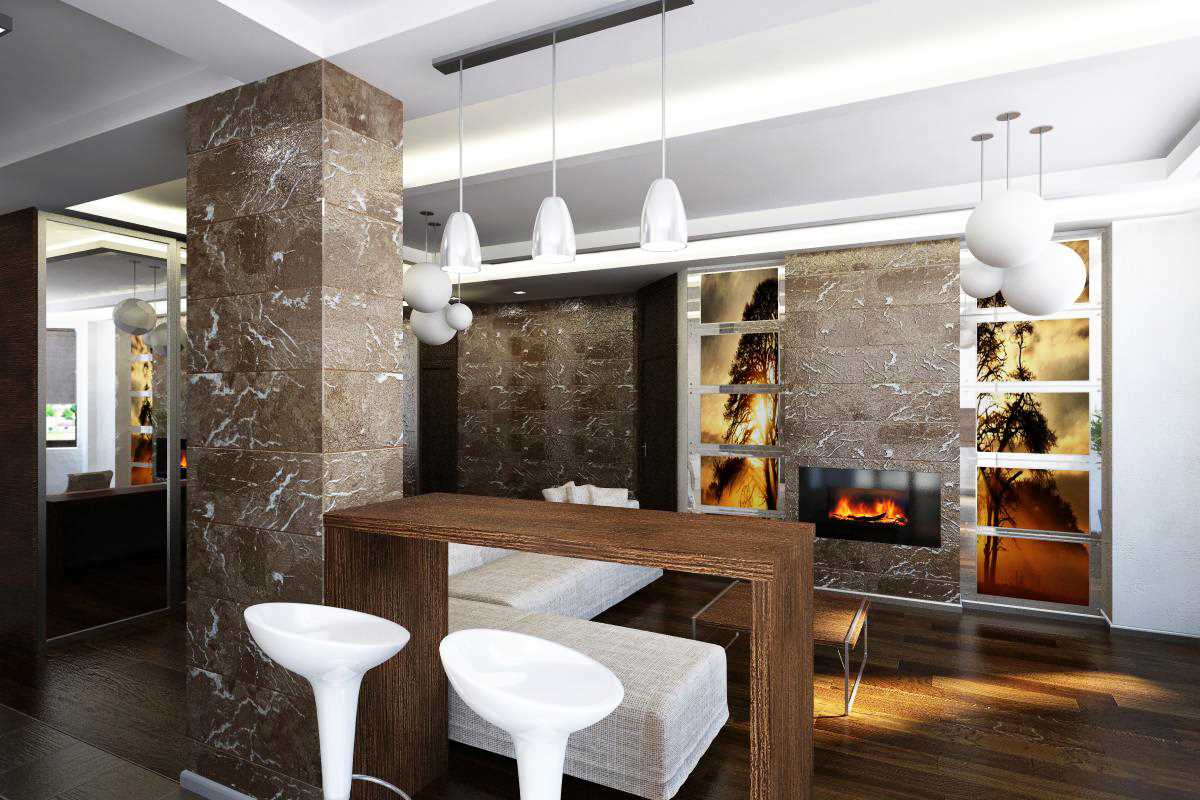 Appartement de 3 chambres a un espace énorme, ce qui signifie qu'il a un grand nombre d'avions différents. Vous pouvez créer l'effet d'espace volumétrique en décorant les murs à l'aide de la technique du stuc vénitien. La composition en minéraux naturels assure la stabilité de cette finition à la saleté et aux dommages divers.Mais ce genre de décoration murale est très cher. Par conséquent, le papier peint, les peintures et les panneaux en plastique sont populaires dans un décor.