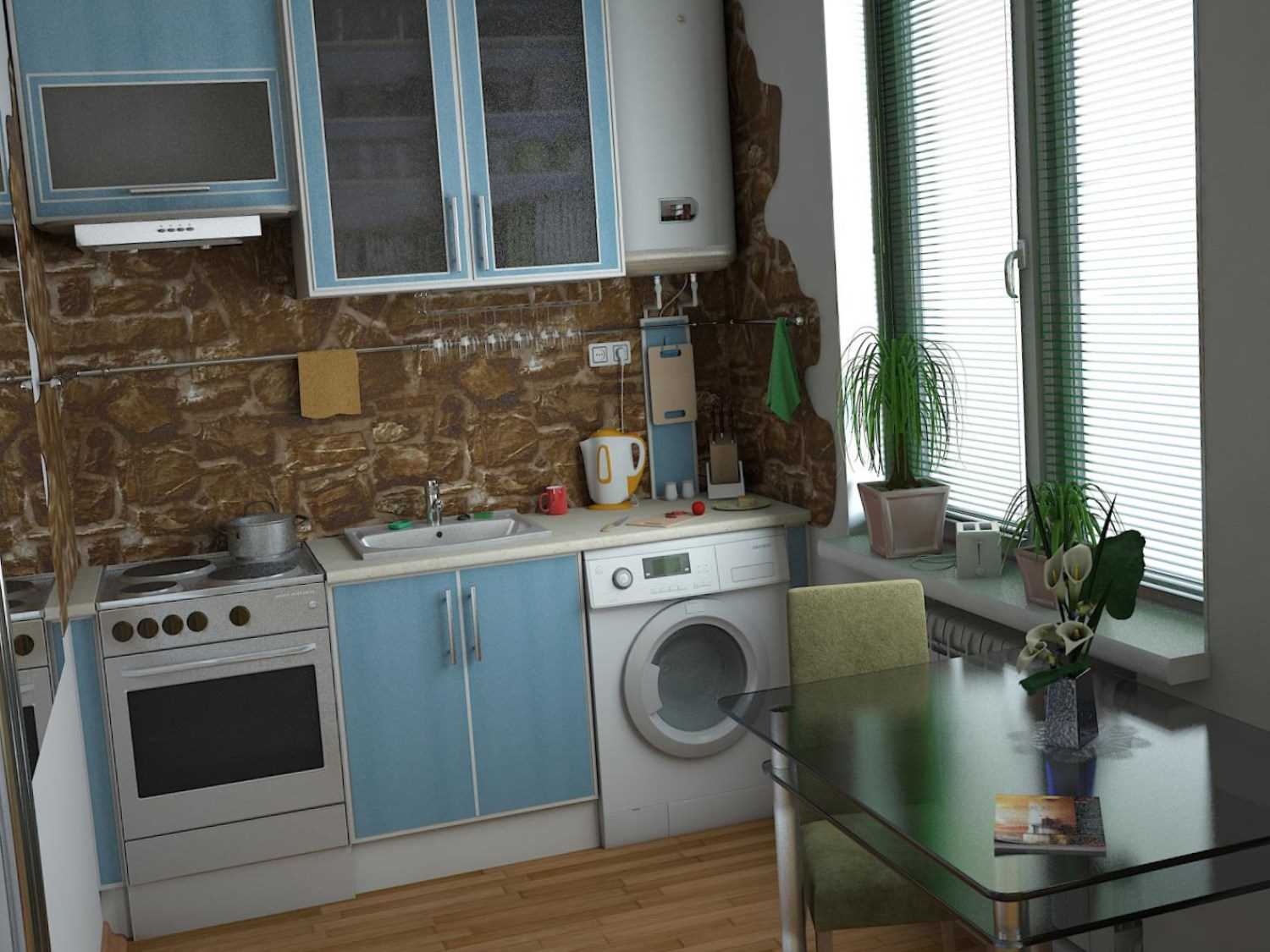 La cuisine doit être divisée en 3 sections: un endroit pour manger, un plan de travail et une salle à manger. Les designers d'intérieur recommandent d'utiliser la couleur principale pour les murs de la cuisine et d'ajouter des nuances supplémentaires qui se combinent les unes aux autres ou créent un contraste en tant qu'éléments de décoration.