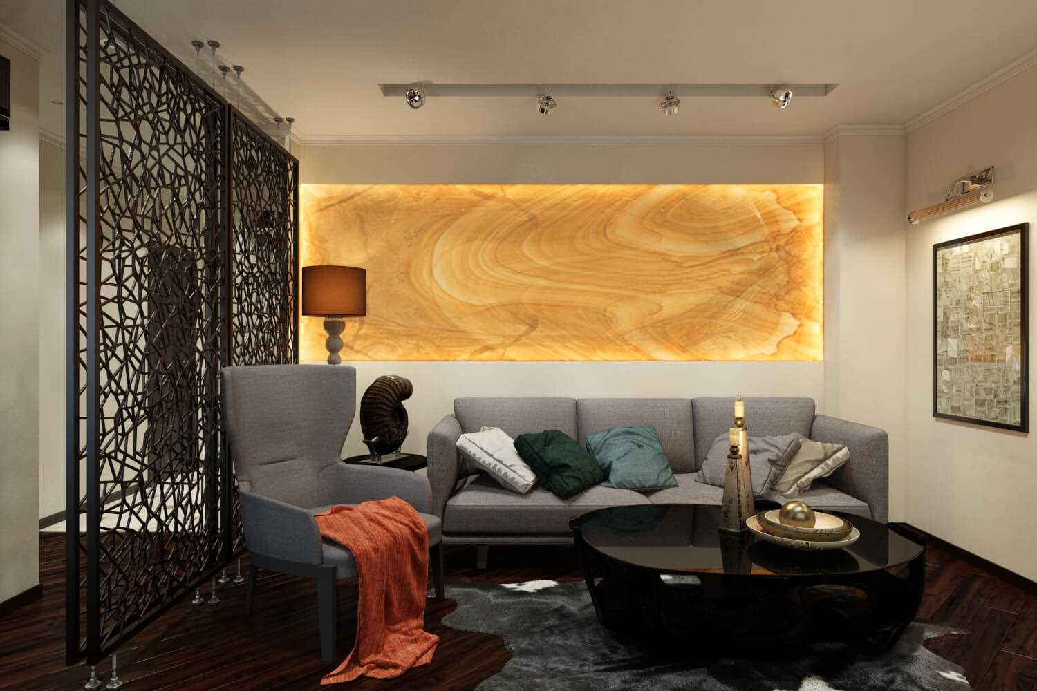 Des planches en bois avec un bel éclairage complètent parfaitement le design du salon