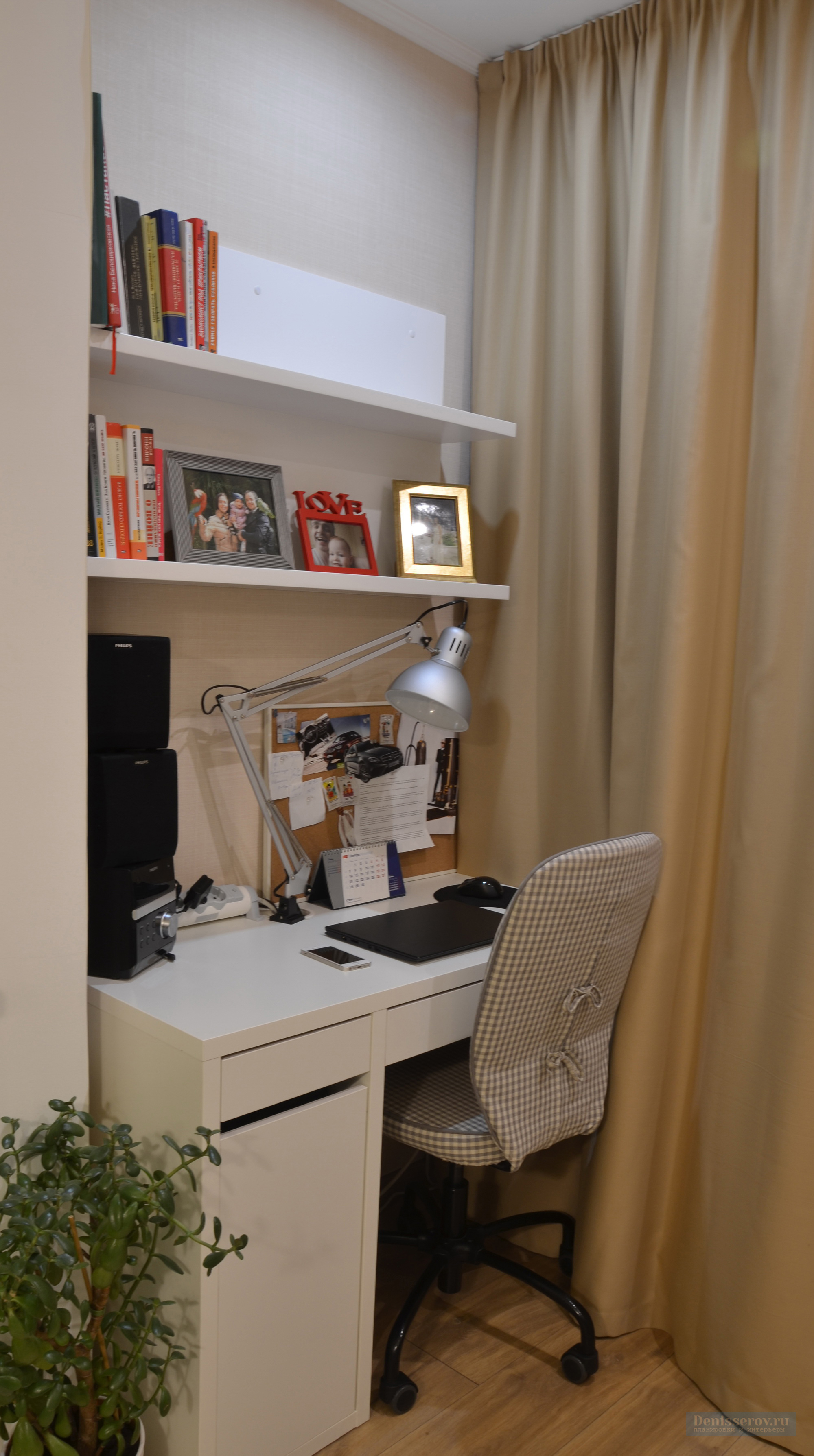 Le lit est situé près de la fenêtre, il y a une sorte de mini-bureau - un petit bureau avec une chaise de travail.