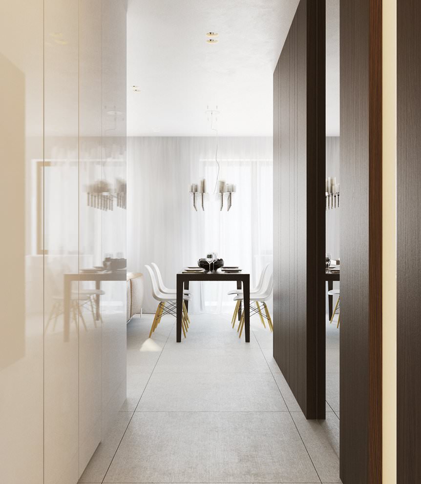L'appartement est décoré dans un style minimalisme, de sorte que la composition respire l'expressivité, la concision, la clarté et la clarté.