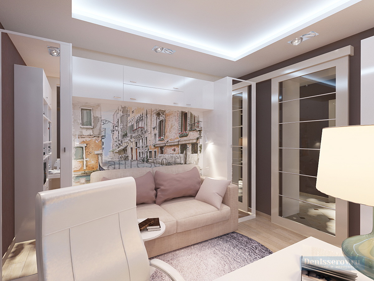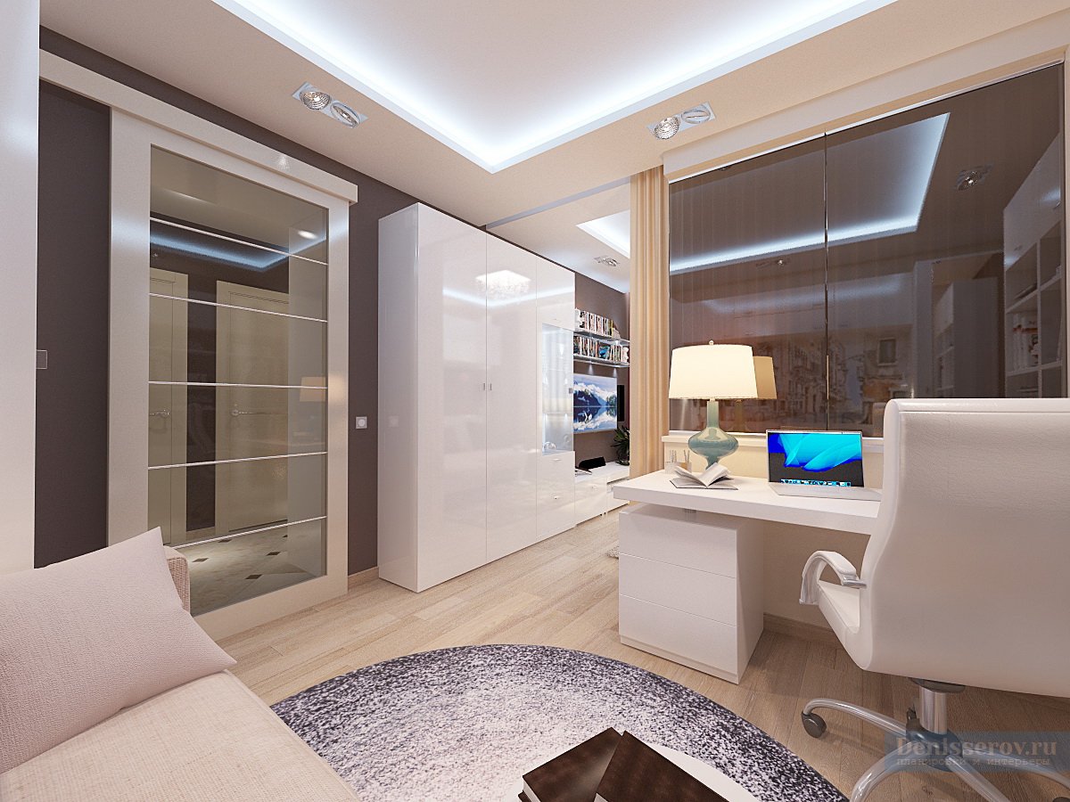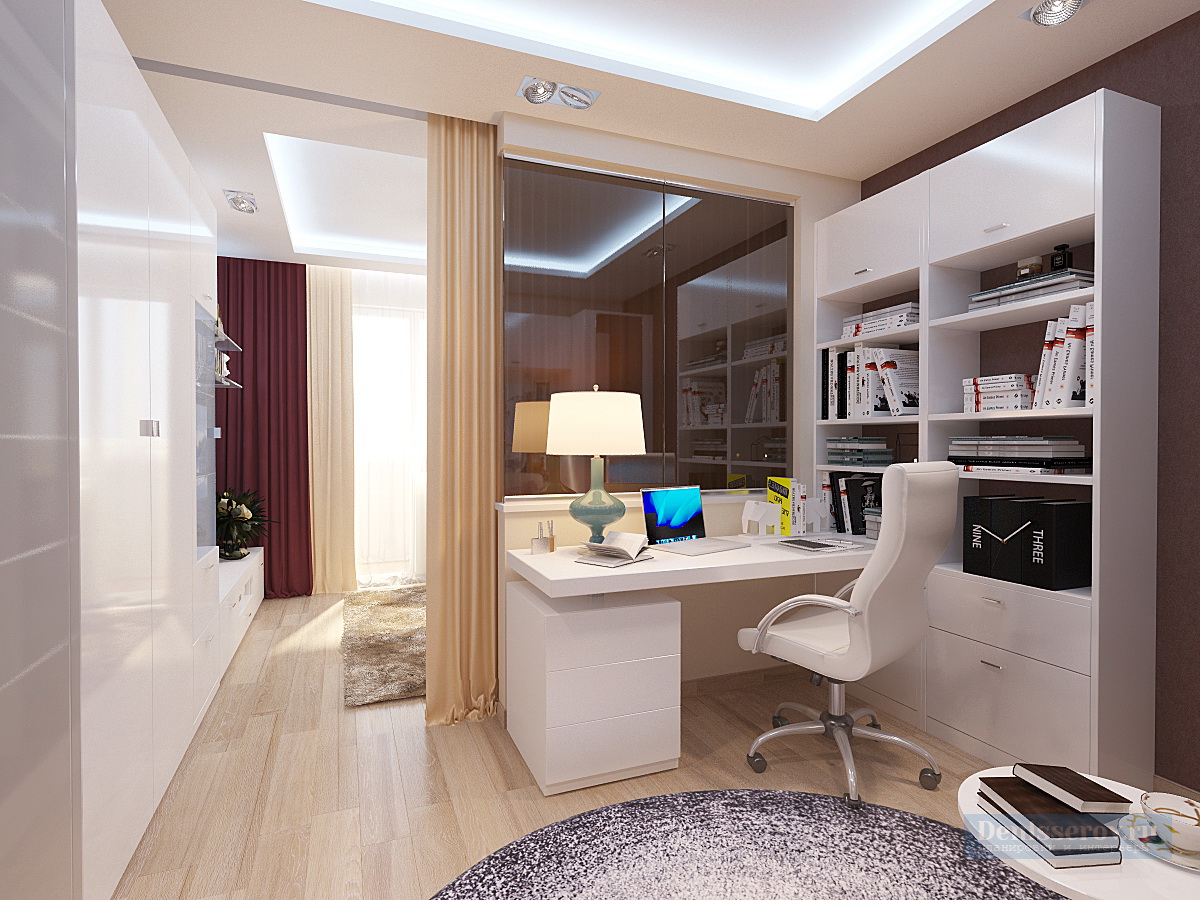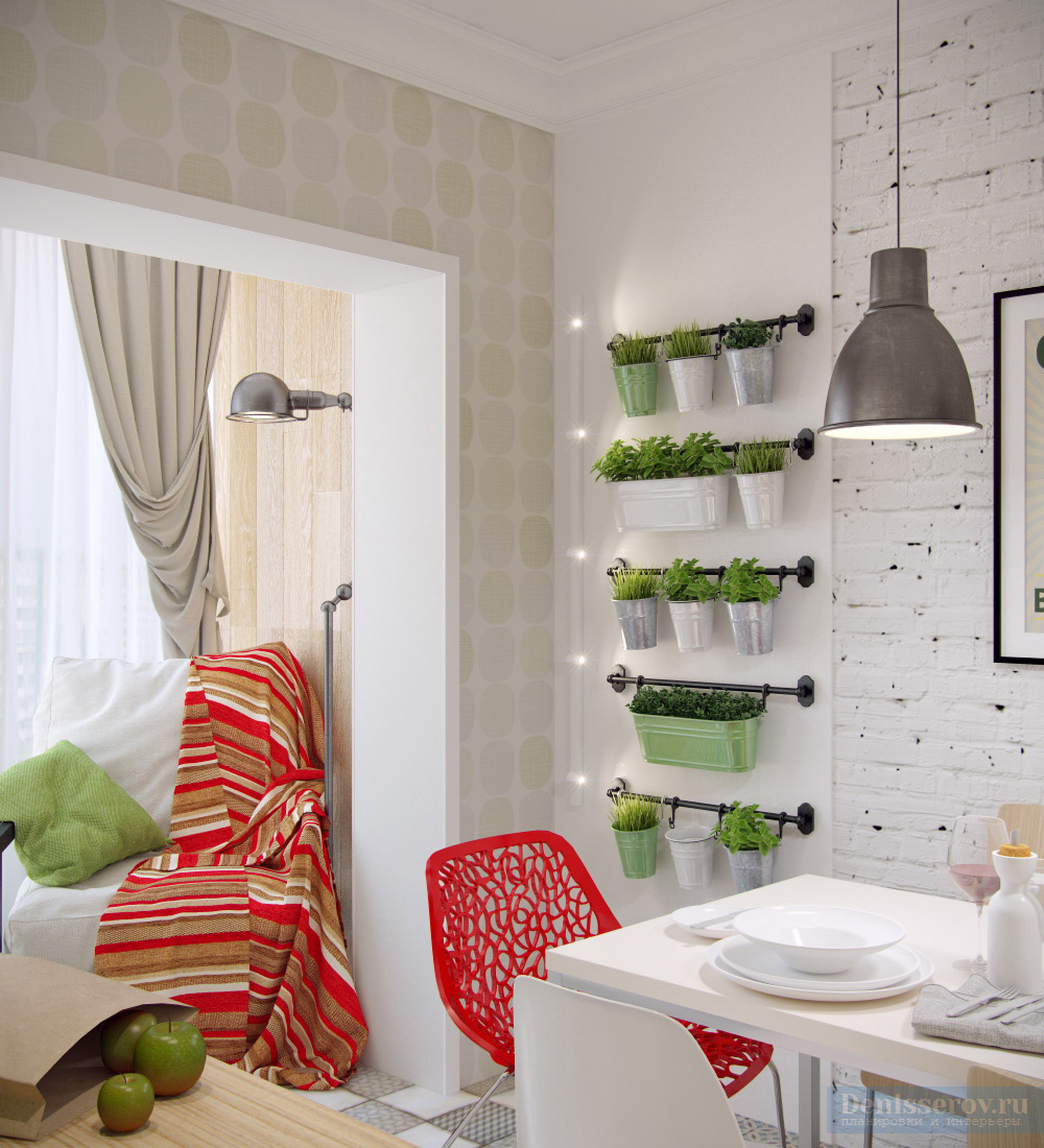 Red dans sa conception alloue activement une zone de loisirs dans le salon et un bureau dans la loggia, les reliant logiquement entre eux. Un motif noir et blanc gracieux orne la tête du lit.