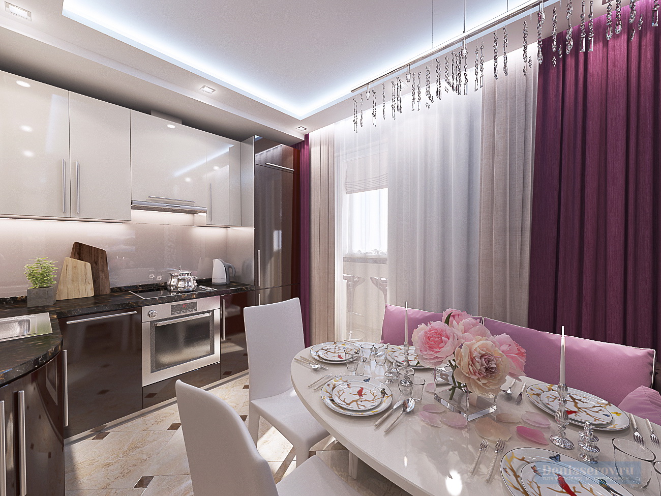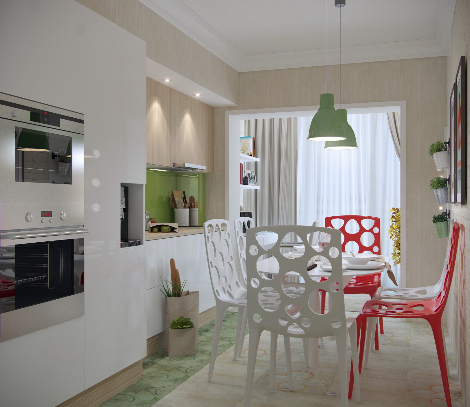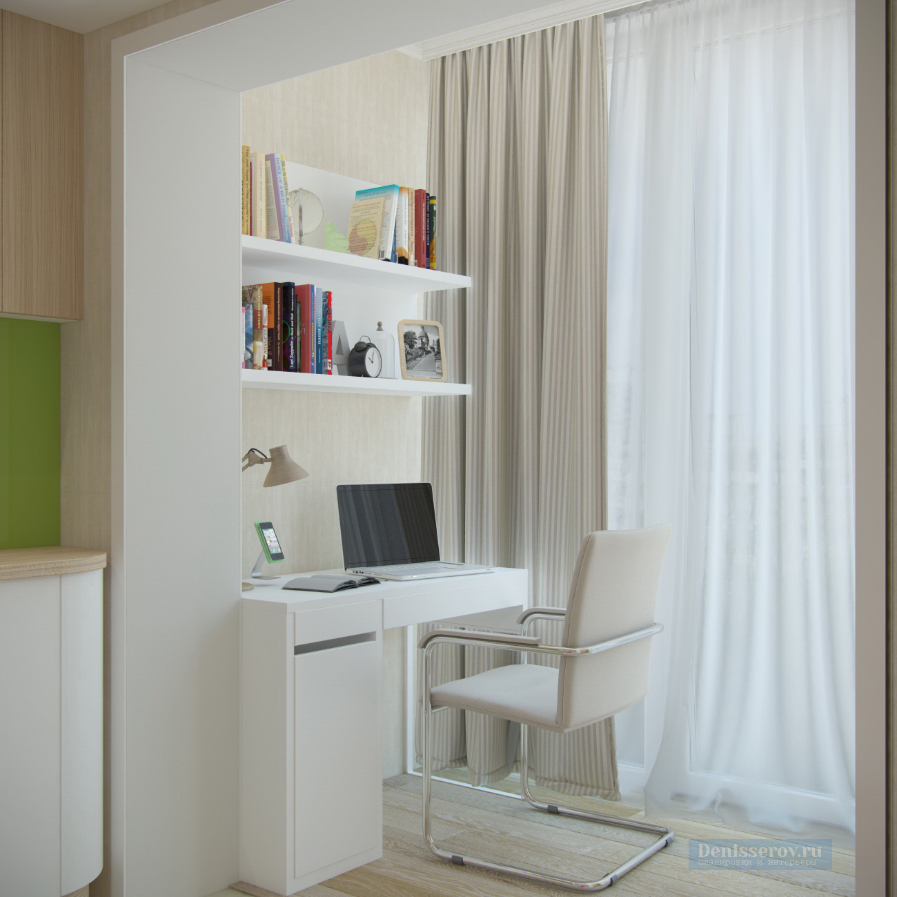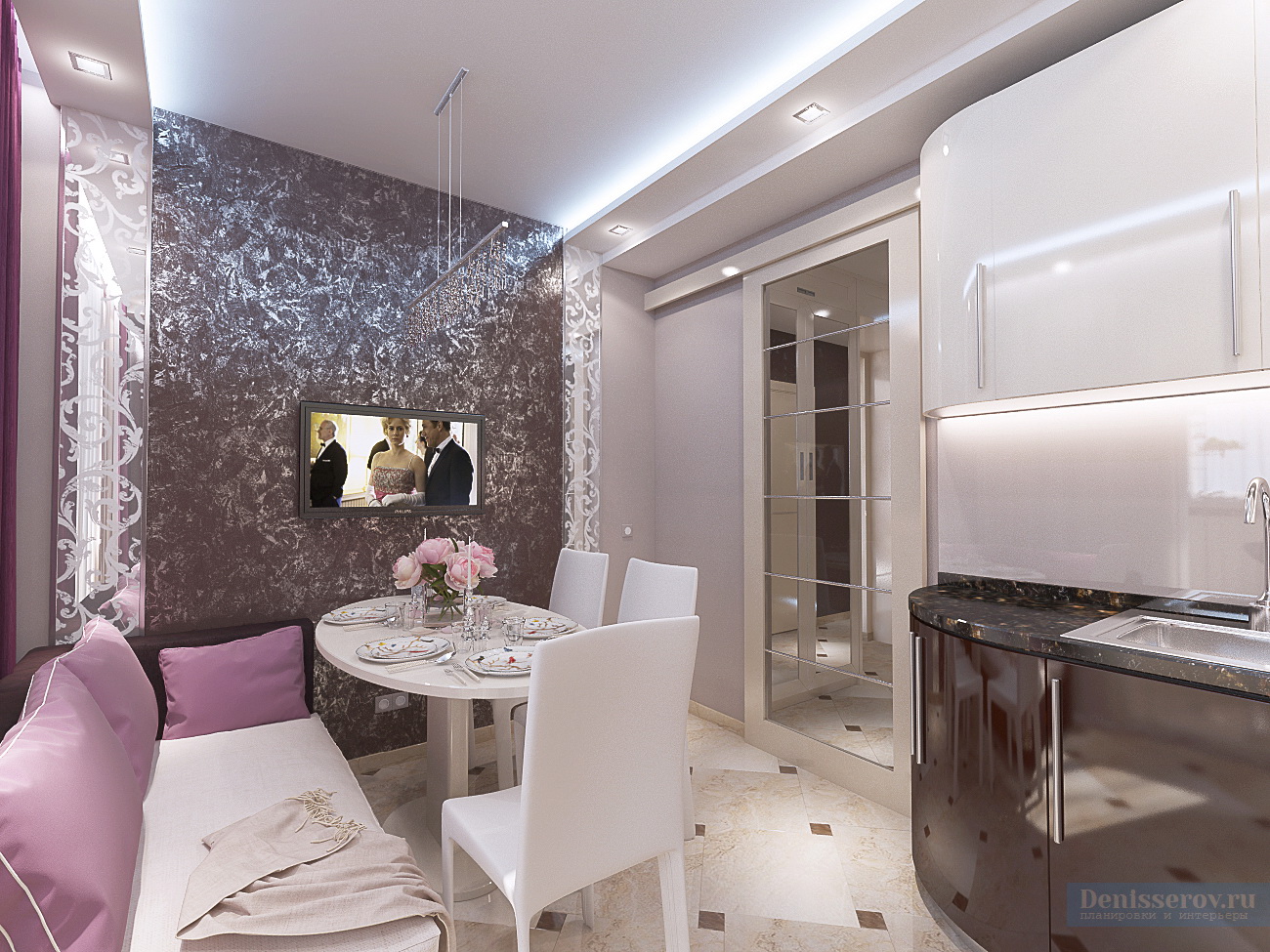 Red dans sa conception alloue activement une zone de loisirs dans le salon et un bureau dans la loggia, les reliant logiquement entre eux. Un motif noir et blanc gracieux orne la tête du lit.