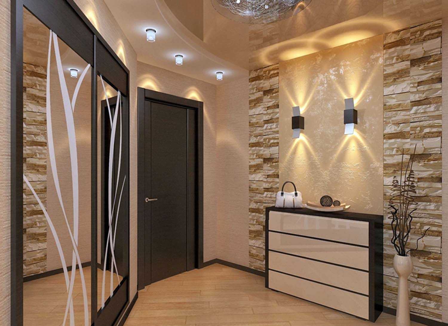 - Dans les couloirs des appartements urbains, il n'y a généralement pas de fenêtres et on accorde beaucoup d'attention à l'éclairage. Les lampes à diode, qui sont encore très économiques, sont considérées comme modernes.