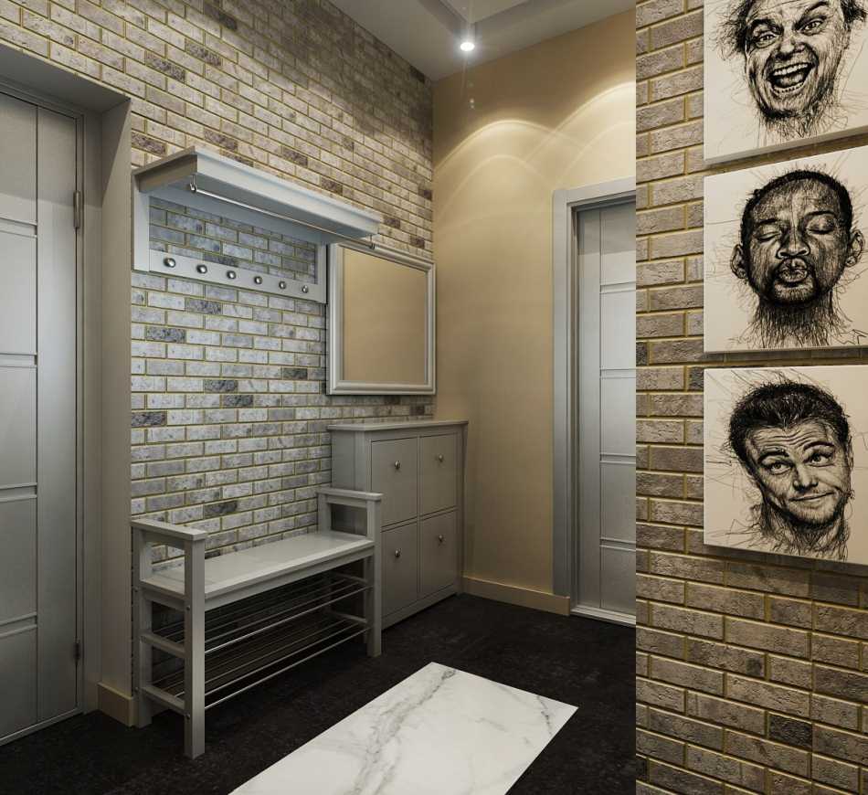 La brique décorative ou la pierre «sauvage» sur une partie du mur est un décor noble du couloir de l'appartement. Il n’est pas nécessaire de poser l’ensemble du mur, il suffit de faire de la maçonnerie artificielle dans un coin, près de la porte d’entrée ou entre les portes intérieures.