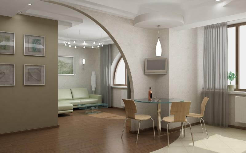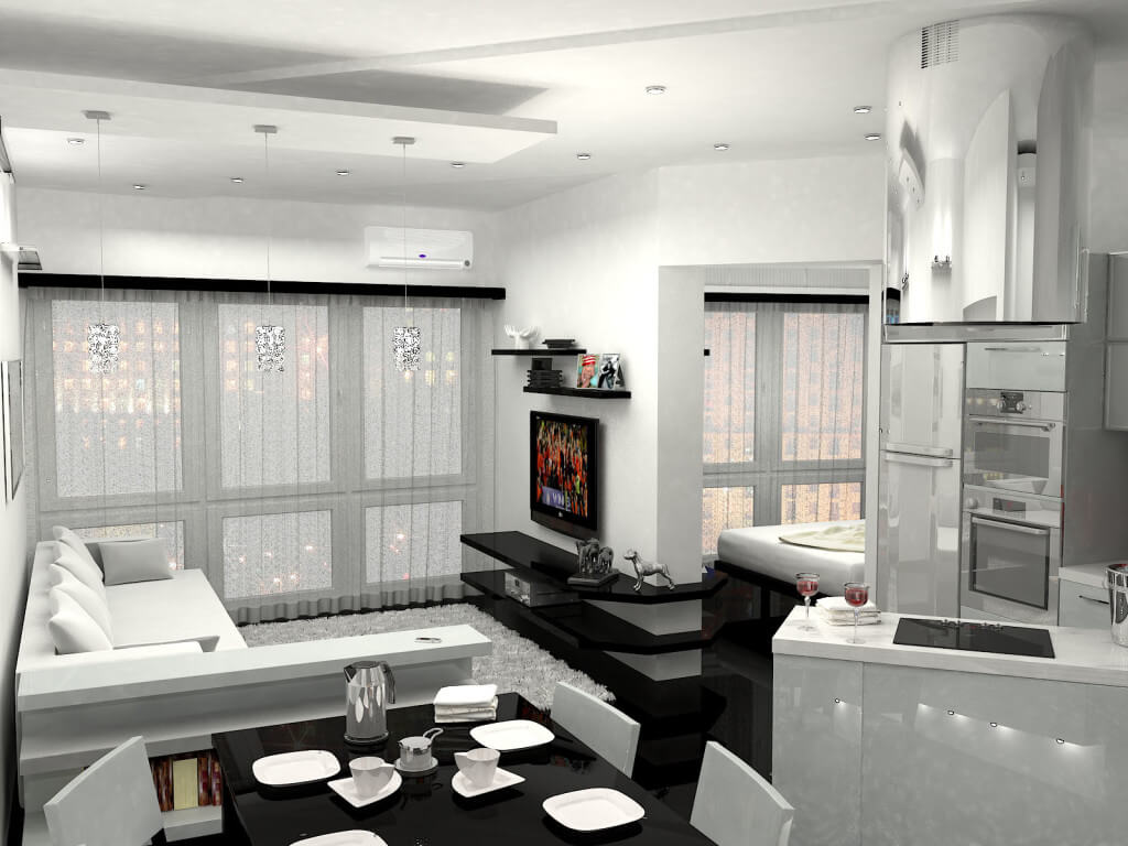 | Intérieur léger et aéré | Pour augmenter visuellement l'espace, vous pouvez utiliser des surfaces miroirs, le zonage à l'aide de cloisons en tissus légers et translucides, un verre fin et résistant. Si les partitions ne sont pas nécessaires, le zonage peut être effectué pendant les réparations. Un point important ici est la sélection compétente du matériau de finition. Le sol dans les différentes zones doit varier: dans la cuisine - carrelage, salle de séjour dans le stratifié. Dans la zone de couchage, vous pouvez poser un tapis moelleux. Chaque zone doit avoir un éclairage individuel. |