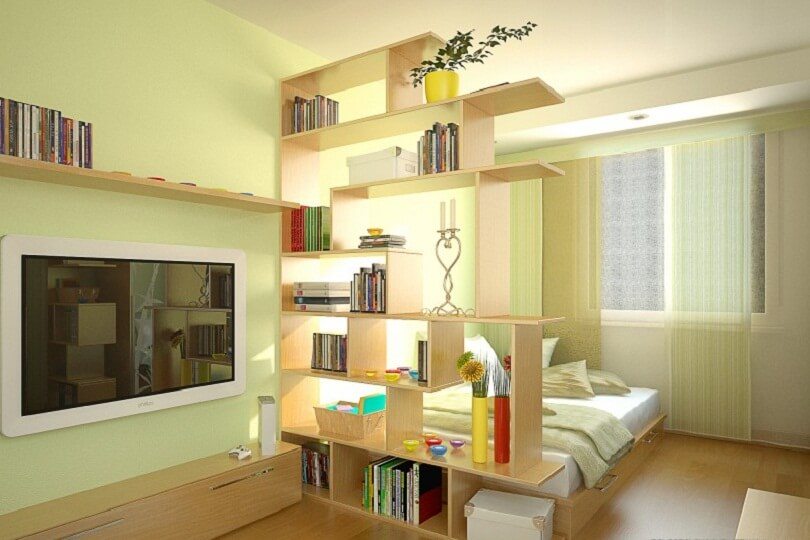 Si vous n’aimez pas les couleurs vives, vous pouvez définir le zonage en utilisant des cloisons lumineuses ou aériennes. Par exemple, une étagère ouverte du plafond au sol.