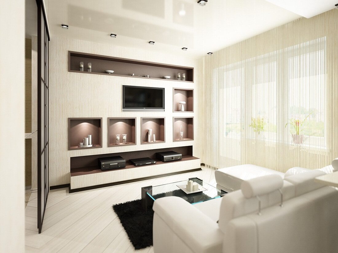 L'intérieur d'un appartement d'une pièce implique des éléments de mobilier compacts. Plus souvent, ils glissent ou se plient. La couchette peut être surélevée sur le podium, à l’intérieur de celle-ci, pour monter des boîtes à linge, des objets. Actuellement, les fabricants offrent un vaste choix de meubles transformants.