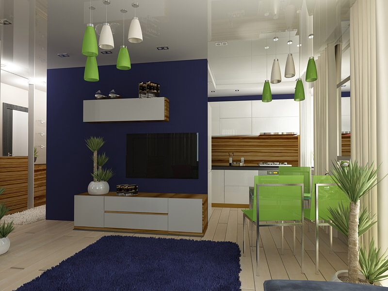 | Accent | N'utilisez pas uniquement des couleurs sombres ou claires à l'intérieur d'un studio. Il y a 2-3 accents principaux. Par exemple, une étagère sombre et des murs clairs, ou, les murs et le plafond sont clairs, et le sol est saturé, à l’ombre sombre. Mais n'utilisez pas beaucoup de noir, cela réduira visuellement la pièce. |
