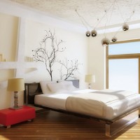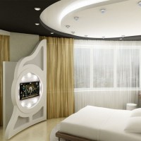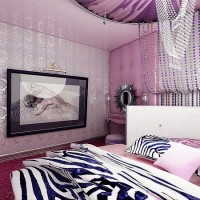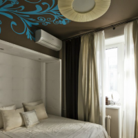 Habituellement, le plafond n'a pas beaucoup de temps pour les réparations - il est recouvert de peinture blanche.Pendant ce temps, le plafond occupe un sixième de la pièce et vous devriez y prêter attention. La couleur blanche traditionnelle du plafond est une solution attrayante (elle est bon marché, relativement rapide et ne nécessite pas de choix de couleurs pour le jeu de couleurs principal de la pièce), il est donc judicieux d'essayer d'autres couleurs pour cette partie de la chambre à coucher. Le plafond blanc augmentera visuellement les murs de la pièce, tandis que les couleurs pastel, douces et sombres donneront à la pièce une sensation d'intimité et de confort. Il est vrai que pour les petites pièces, il est préférable de ne pas repeindre le plafond avec des couleurs sombres - cela peut jouer une farce cruelle et rendre la pièce encore plus petite qu’elle ne l’est.