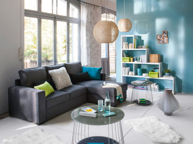 Des accents lumineux de nuances turquoises à l'intérieur d'un salon gris