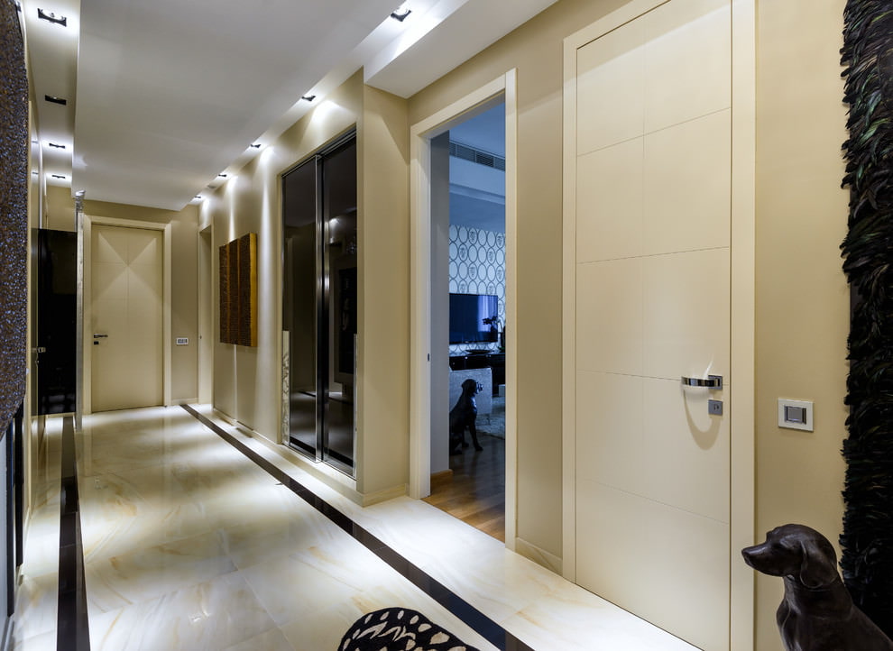 Le hall d'entrée est de style classique avec des portes intérieures blanches et un sol en céramique brillante avec un décor intéressant «sous le tapis».
