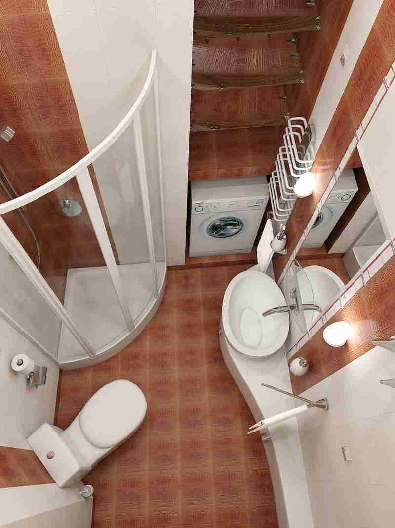 C'est au mieux. Au pire, pas plus de 3 mètres carrés sont disponibles. mètres. Dans une si petite pièce, vous pouvez poser une douche avec des ailes de verre. La surface brillante agrandit visuellement l'espace, le rendant de plus en plus léger. Les miroirs et les carreaux brillants sur les murs créeront également un effet d'expansion.