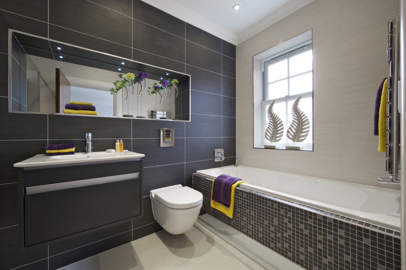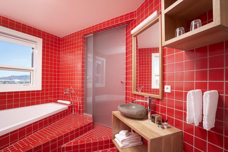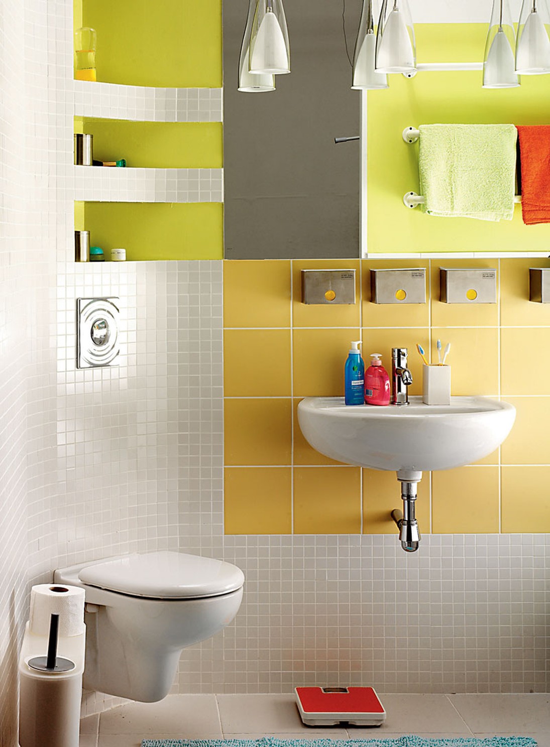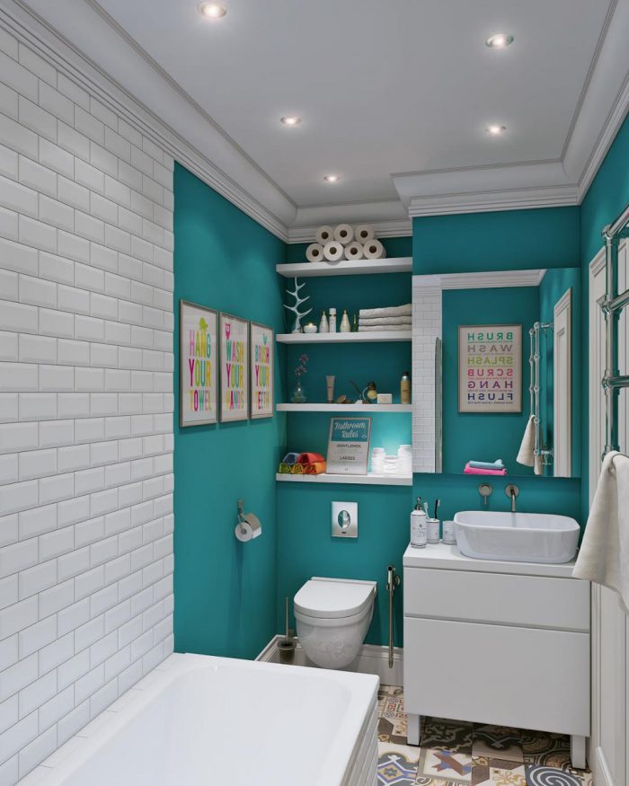 La couleur est un excellent moyen de zoner des espaces confinés. Le coin avec la baignoire peut être indiqué dans une couleur, et le lavabo dans une autre