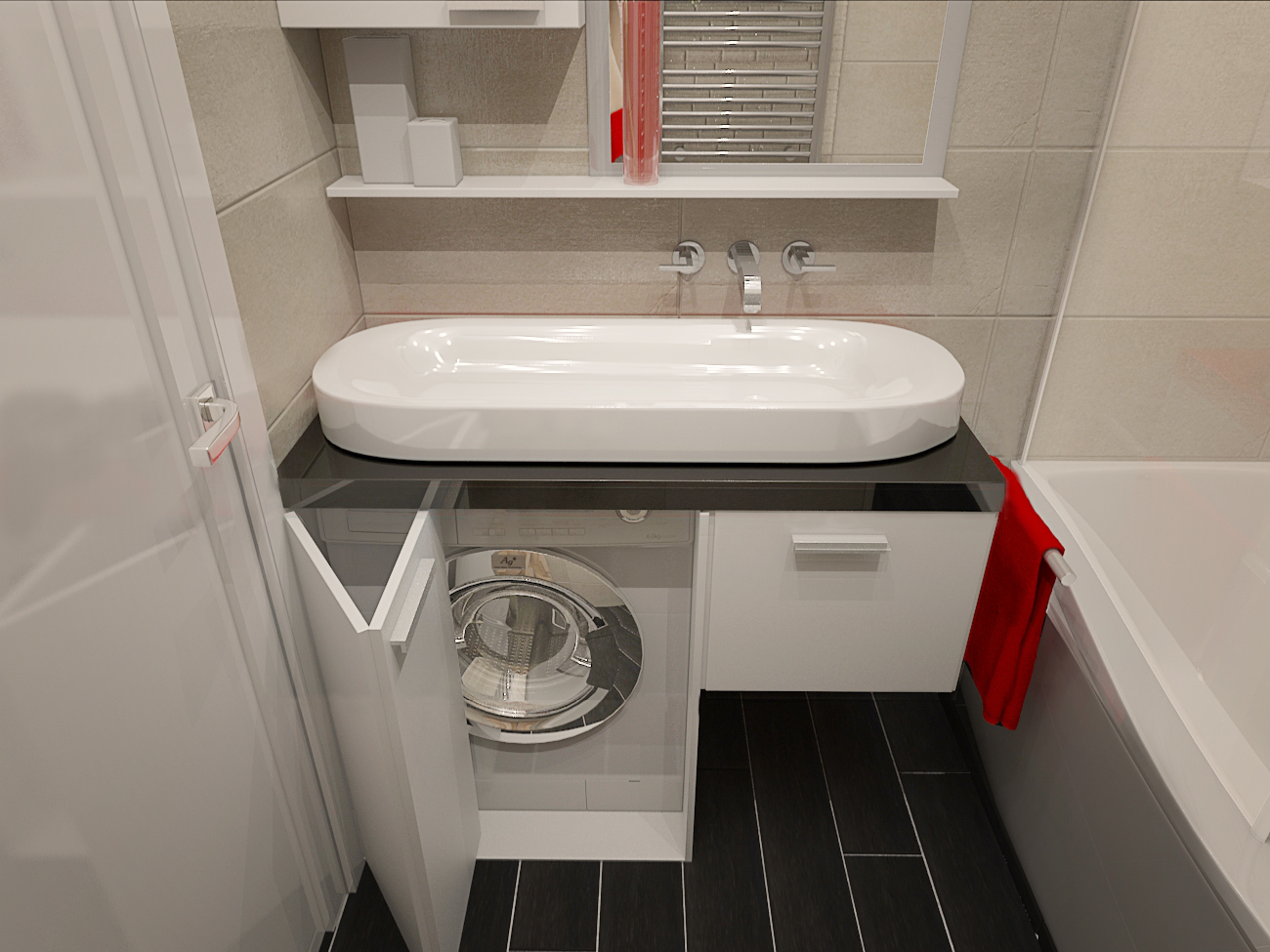 Pour économiser de l'espace, combinez l'évier et la machine à laver avec un plan de travail commun