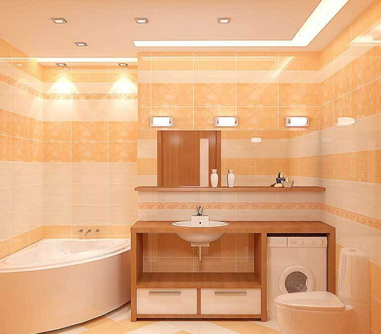 La combinaison de teintes chaudes et froides est un bon choix pour une petite salle de bain