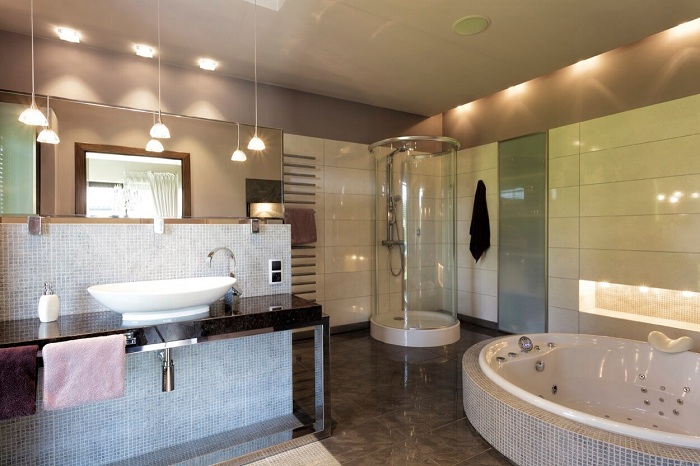 - Éclairage intense. La lumière naturelle ne peut souvent pas entrer dans le bain. Par conséquent incarner un éclairage artificiel lumineux. Pour cela, des projecteurs de périmètre sont appropriés.