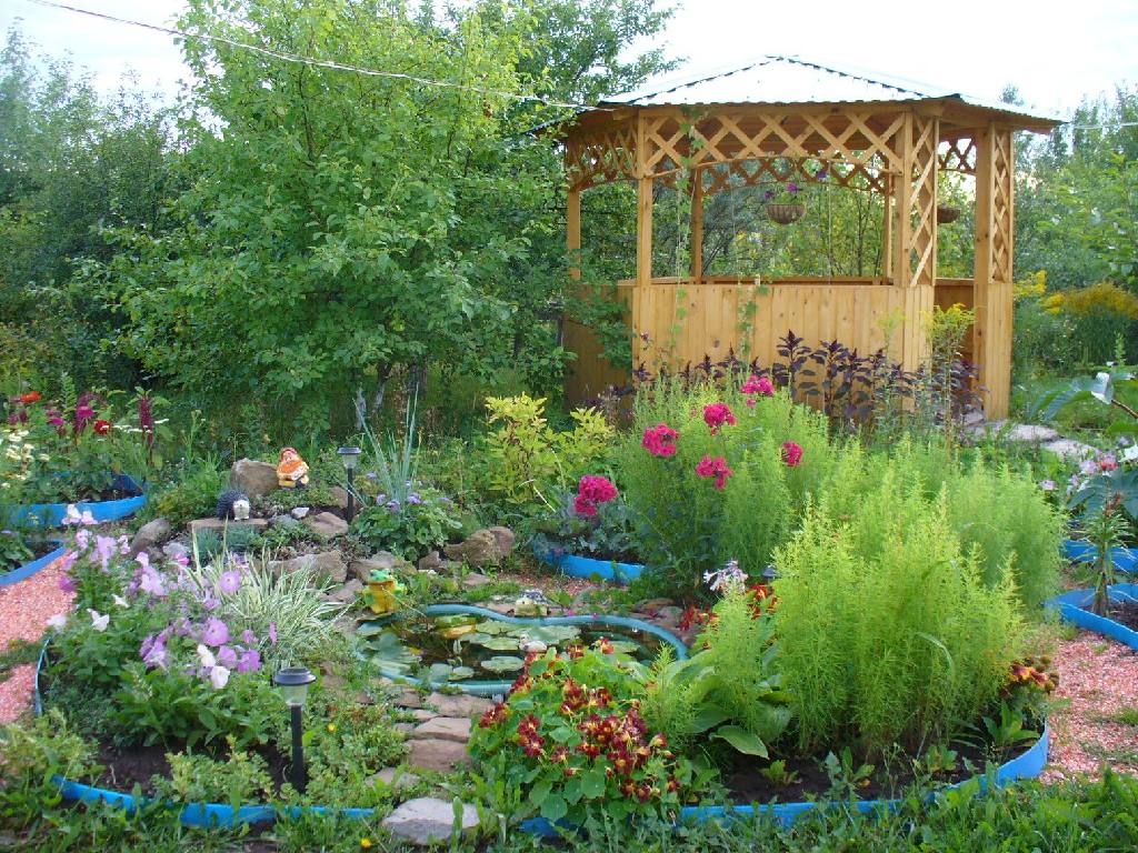 Le jardin peut être placé juste en dessous du belvédère. Vous ne devez pas choisir des formes rectangulaires ou carrées, il est préférable de mettre en évidence une zone circulaire - elle semble visuellement plus petite.
