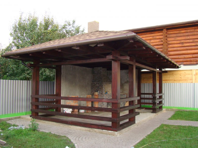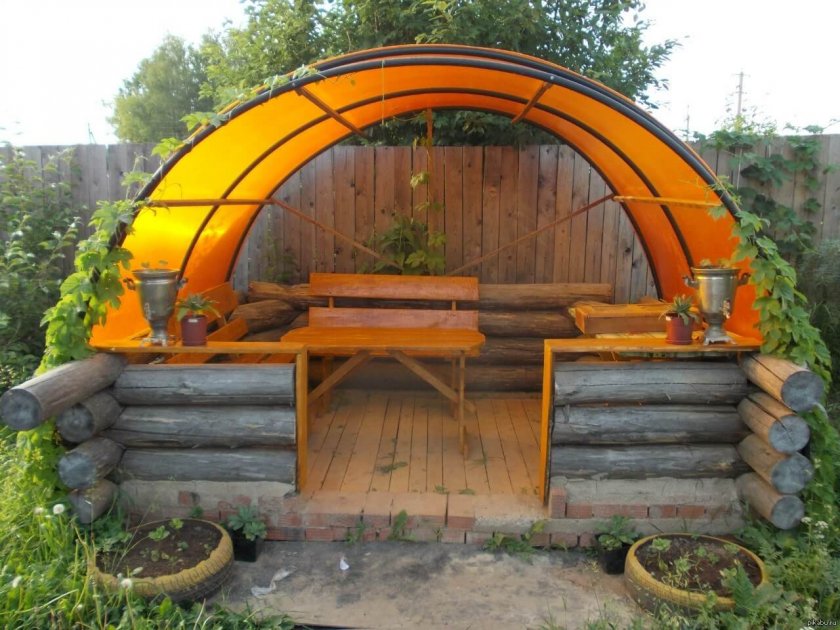 La couronne de tonnelle peut être faite de grumes de chêne ou de tout autre matériau disponible. La principale exigence ici est la force et la résistance à l'humidité. De plus, la couronne en bois doit être scellée de la fondation avec des feuilles de feutre pour toiture. Les colonnes sont en bois ou en pierre (selon les préférences).