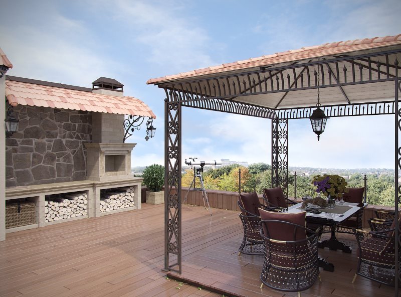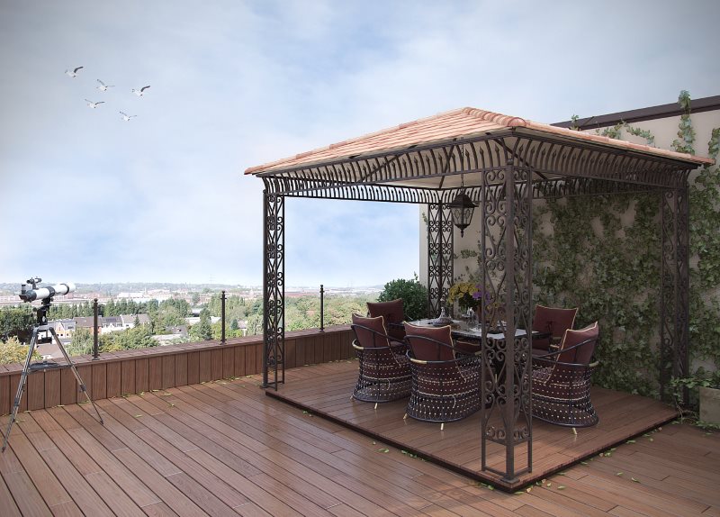 L'option initiale est l'organisation d'un espace de loisirs sur le toit du chalet. Mais une telle disposition suggère l’idée: comment disposer un kiosque sur le toit de la maison? Quel style choisir? La bonne réponse est un - le style d'une telle solution doit être combiné avec la conception globale de la maison.