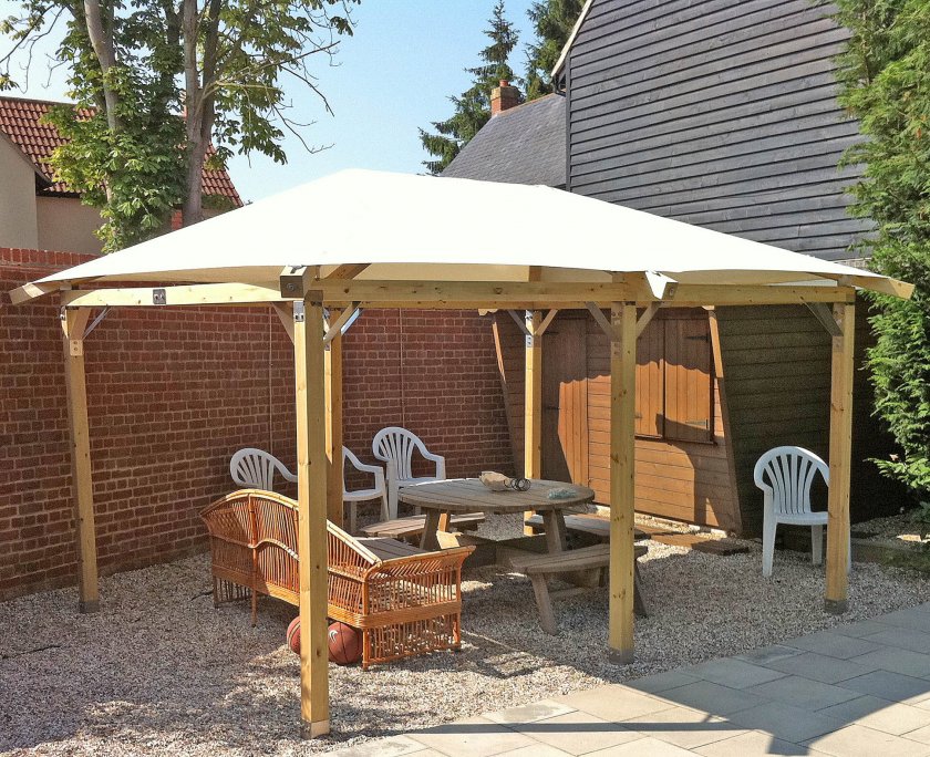 Avec une petite taille du site, il est nécessaire de concevoir un belvédère en matériaux légers. Il peut s'agir de racks en aluminium, formant un plexus de structures au-dessus des têtes de résidents, sur lesquels le tissu de la tente est porté. Les avantages d'une telle amélioration sont la possibilité de transférer le gazebo à un autre endroit approprié.