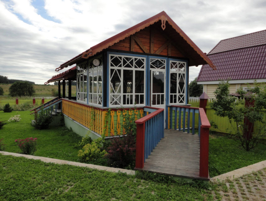 Le design du gazebo doit correspondre au style général de la maison et du jardin. Si la clôture est en bois et peinte dans une structure naturelle, la tonnelle doit être faite d'éléments en bois ou de leurs dérivés.