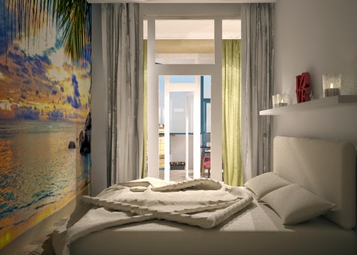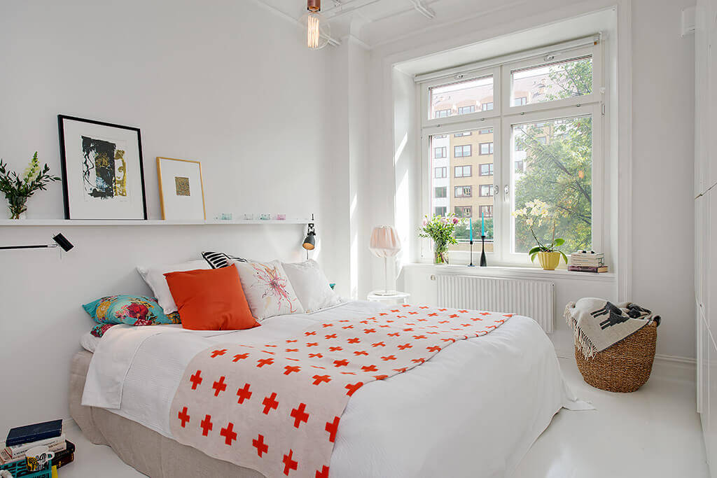 Cette chambre est très petite, mais en raison de la couleur blanche associée à des nuances de vert et de rose, la chambre à coucher semble assez confortable