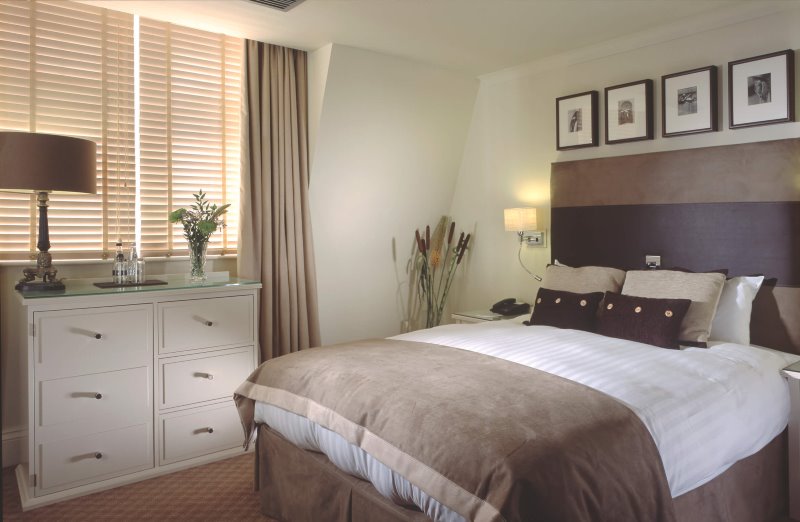 Chambre dans les tons beige et marron.